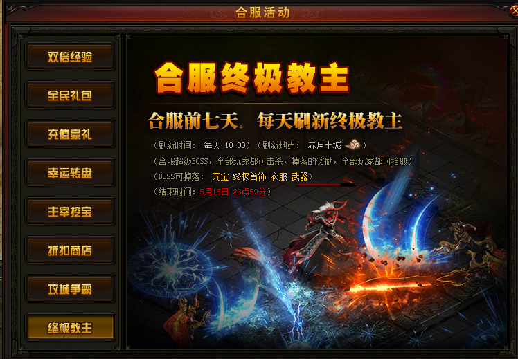 8、终极教主,合服前七天,每天18:00在赤月土城刷出终极教主,击杀后一定几率掉落终极首饰,衣服,武器,所有玩家均可拾取;